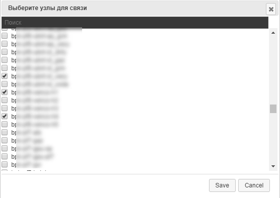 Перед нами открывается окно выбора со всеми нанесенными на карту объектами. Можно найти узлы по имени или вписать его имя в строку поиска вверху. Связь можно установить как с 1 объектом, так и с несколькими сразу. Для этого всего лишь необходимо выбрать 1 или более узлов, отметив их в "чекбоксе"