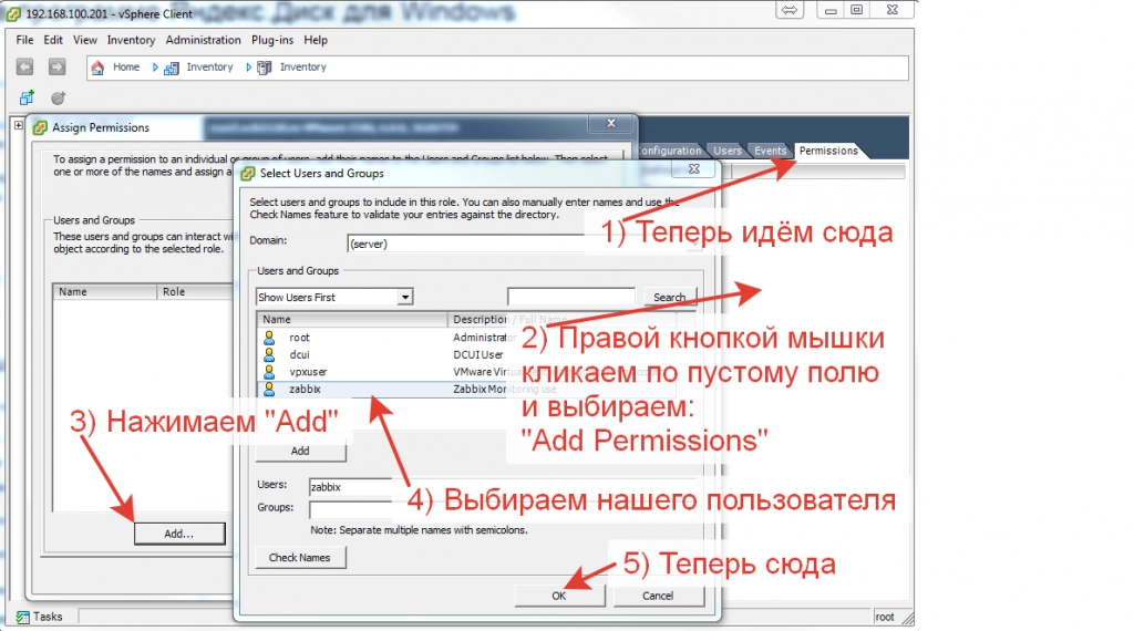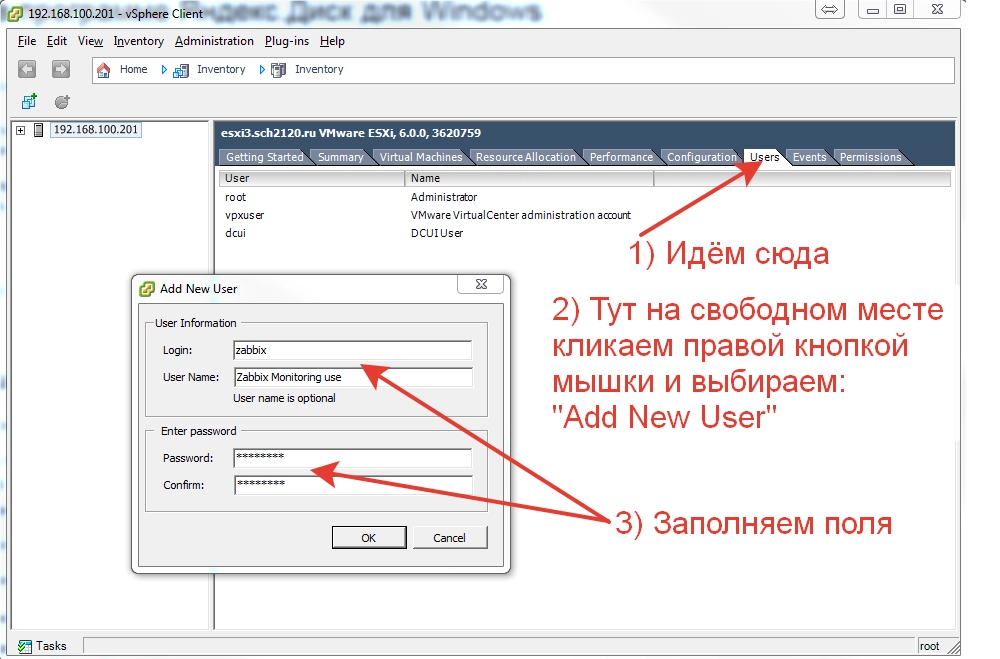 Первым делом, что нам требуется сделать, это создать пользователя в ESXi, которым мы будем заходить и считывать данные для Zabbix.