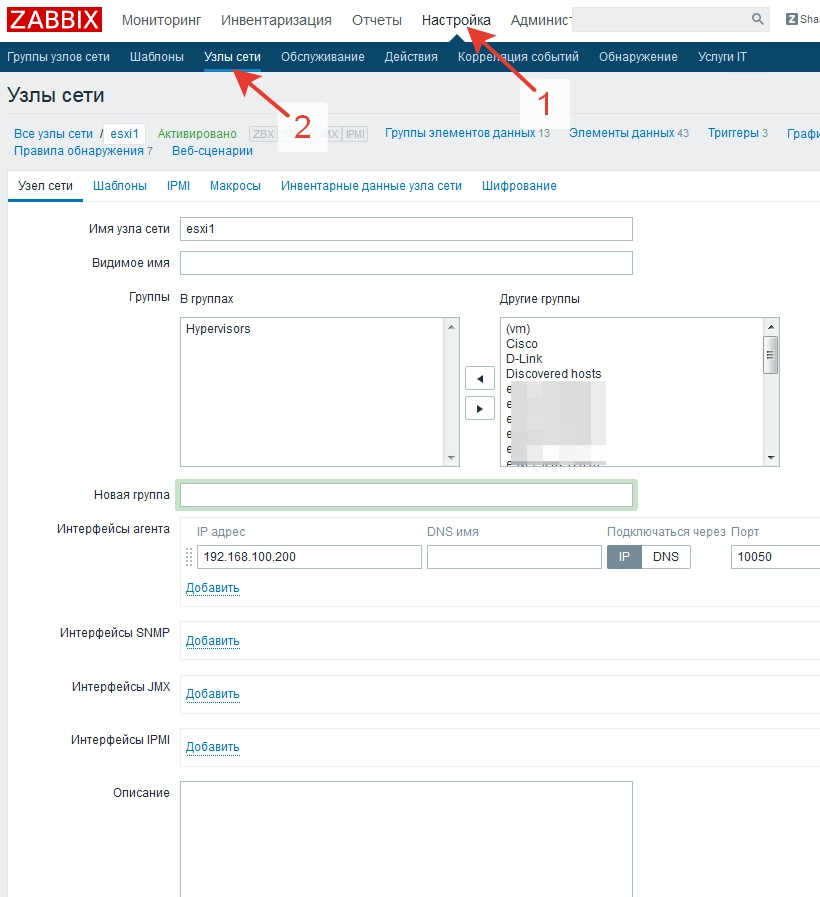 После этого переходим к следующему шагу - добавлению нового узла в zabbix: