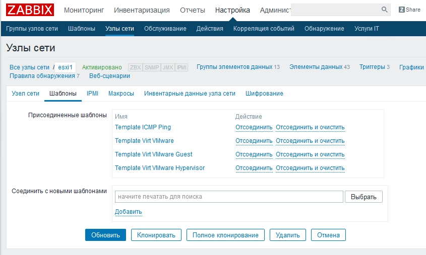 Вот и все. Остается теперь немного подождать, пока шаблоны esxi и создадут список виртуальных машин, имеющихся на нём, в которым в свою очередь прикрепят шаблоны для мониторинга их состояния.