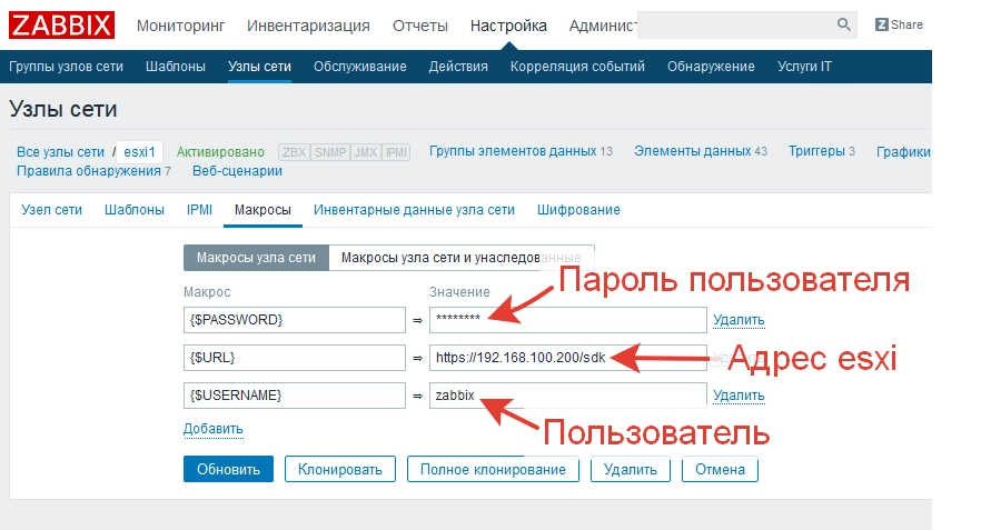 Обязательно заходим в раздел "Макросы" и дописываем туда следующие значения, для авторизации на ESXi, для сбора данных. Без данных макросов мы не сможем подключиться к нашему esxi и получить с него данные!