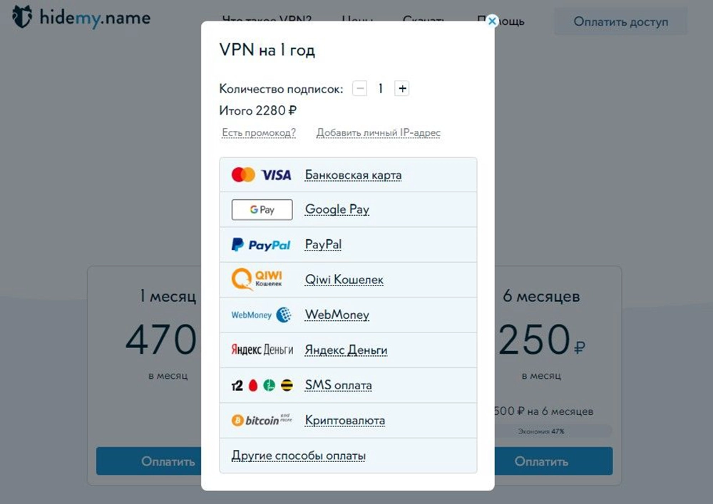HideMy.name предлагает на выбор 6 тарифных планов, в зависимости от периода использования ПО: