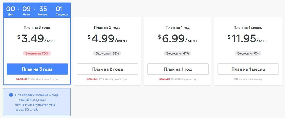 Пользователю предоставляется выбор из 3 тарифных планов: