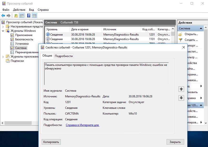 А также просмотреть результаты проверки можно в системном журнале. Для открытия журнала надо нажать Win+R и выполнить команду eventvwr, затем перейти в раздел «Журналы Windows» — «Система» и найти события от источника MemoryDiagnostics-Results.
