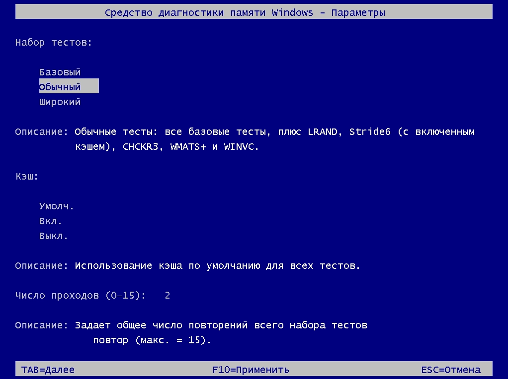 Переключение между настройками осуществляется клавишей TAB, а клавиша F10 запускает проверку с выбранными настройками.