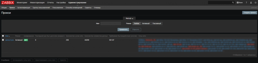 Имя прокси - Имя прокси сервера, должно соответствовать параметру hostname в файле конфигурации прокси Режим прокси - Режим работы: Активный — прокси всегда сам обращается к основному серверу и отправляет данные, Пассивный — команды на получение данных каждый раз инициирует основной сервер Узлы сети - Хосты, которые будут мониториться через этот прокси. Если у Вас есть хосты, которые Вы уже готовы мониторить через прокси, переносим их в левый столбец Описание - Произвольное описание сервера