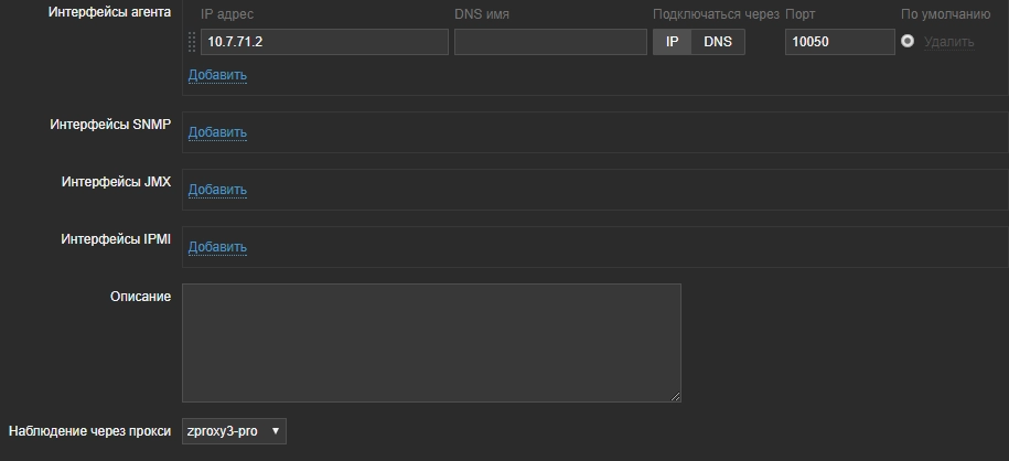 Вводим локальный IP вашего zabbix proxy и выбираем "Наблюдение через прокси" Ваше имя хоста zabbix proxy (в моем случае он называется "zproxy3-pro")