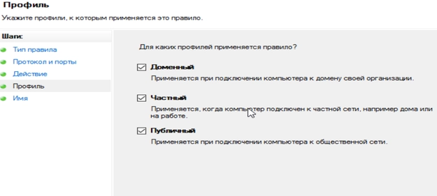 - Для каких профилей применить правило? - здесь ничего не меняем, нажимаем еще раз "Далее".