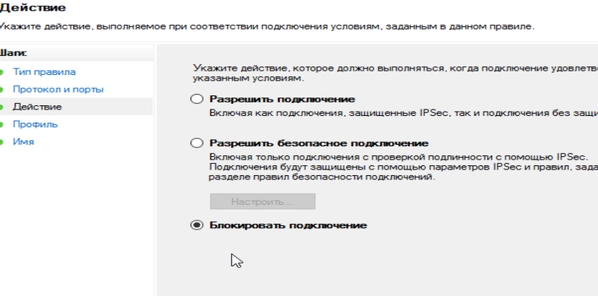 - На этом этапе выбираем "Блокировать подключение", Нажимаем "Далее".