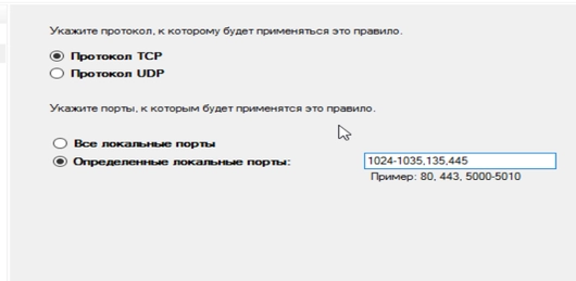 - Отмечаем радиокнопкой "Протокол TCP" и "Определенные локальные порты" , в поле портов вносим запись: "1024-1035,135,445". Нажимаем "Далее"