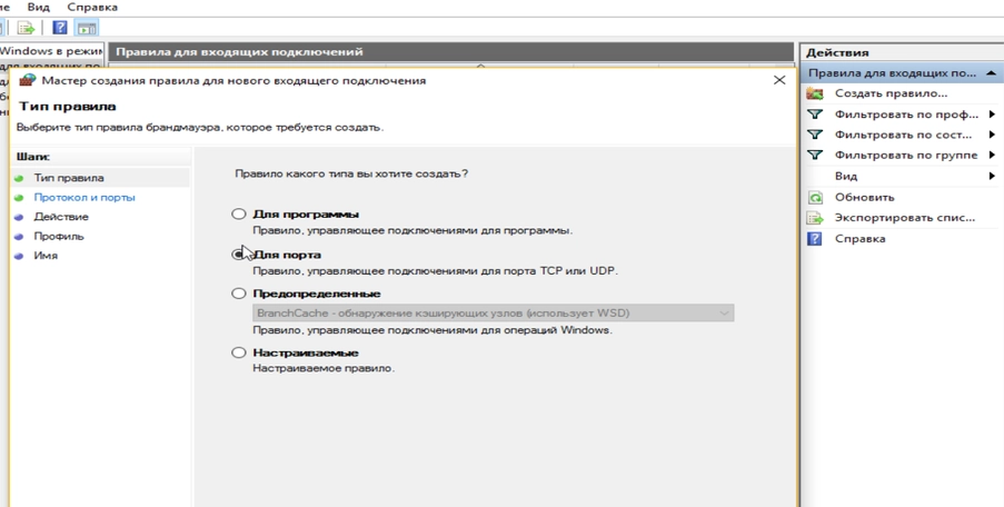 - В панели слева выбрать "Правила для входящих подключений", далее "Создать новое правило".