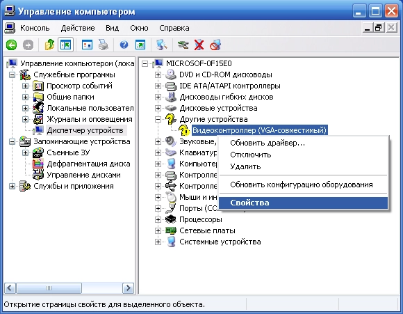 В Windows есть еще один, более удобный способ найти нужный драйвер – по коду устройства. Итак, для начала определим код неизвестного устройства. Жмем правой кнопкой мыши по “Мой компьютер” — далее “Управление”. Выбираем на левой панели “Диспетчер устройств”. Справа мы увидим устройство, для которого необходимо установить драйвер (оно будет отмечено желтым восклицательным знаком), щелкаем по нему правой клавишей мыши, выбираем “Свойства”.  В открывшемся окне переходим на вкладку “Сведения” и в выпадающем меню выбираем “Код экземпляра устройства” (в Windows 7 надо выбирать “ИД оборудования”).