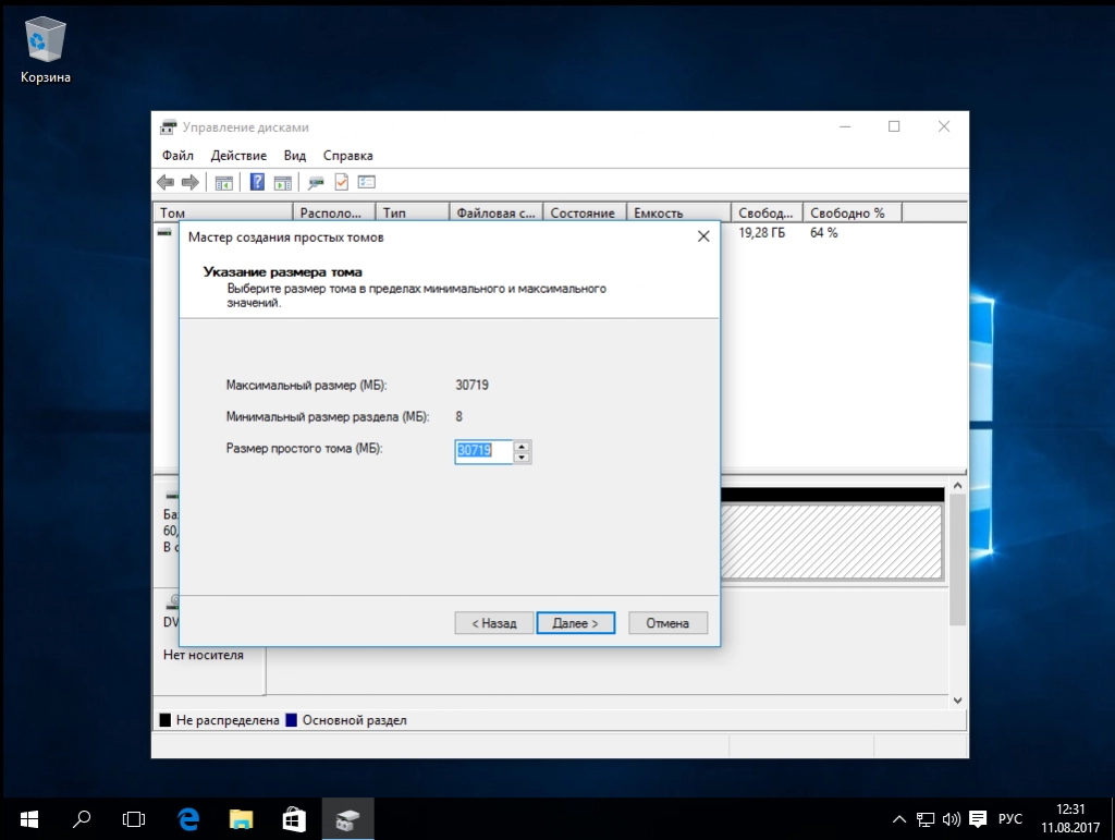 В данном окне мы выбираем, какого размера мы хотим создать том. Мы можем использовать весь объем свободной области, или, например, создать 2 тома по 15ГБ. В нашем случае мы выбираем максимальный размер и нажимаем "Далее"