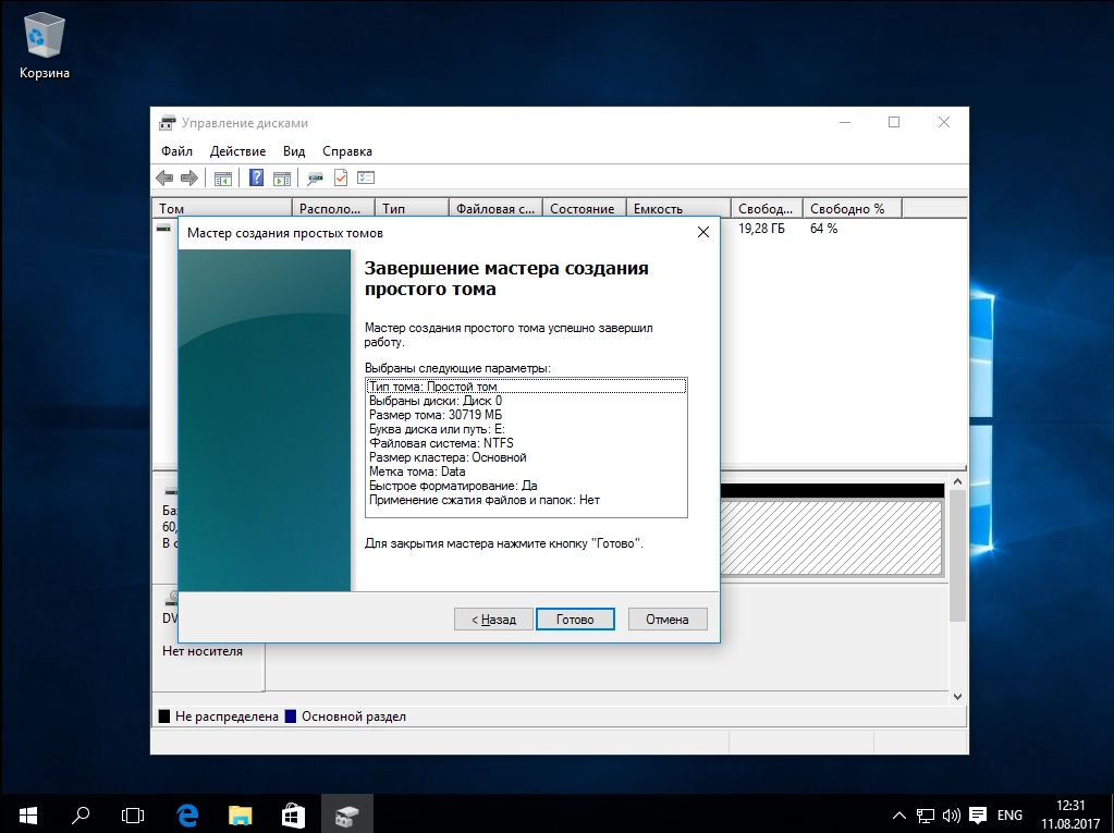 Теперь нам осталось только проверить, все ли мы настроили так, как мы хотели? Если все верно, то нажимаете кнопку "Готово". После нажатия на готово, операционная система приступит к созданию и форматированию нового раздела. Обычно это занимает несколько секунд.