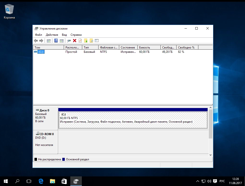 Первым делом смотрим, что у нас вообще есть. В нашем случае у нас 1 раздел объемом 59,9 ГБ.: