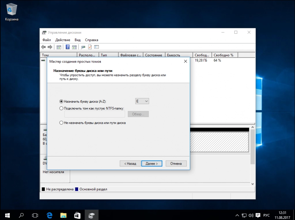 Следующим этапом будет выбор буквы, которую мы назначим нашему новому тому. По умолчанию Windows подставляет ближайшую свободную по алфавиту букву, в данном случае это буква E. Нажимаем "Далее"