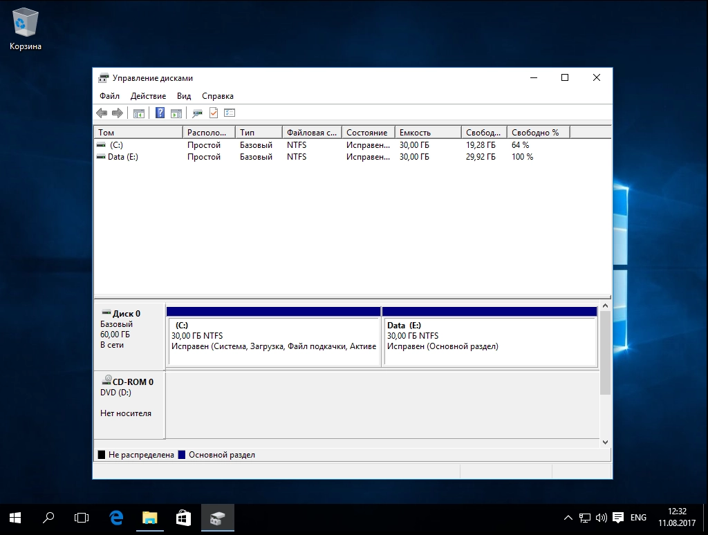После выполнения процедуры в консоли "Управление дисками" мы видим, что у нас проявился второй простой том с буквой диска E и меткой Data, которые мы задали в настройках создания раздела.
