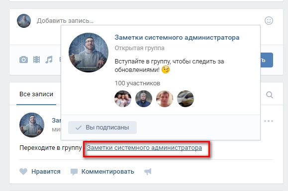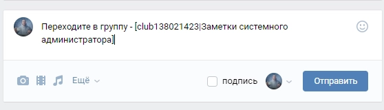 - Чтобы создать ссылку в записи пишем [id_группы_или_человека|Текст ссылки] и все, ссылка готова