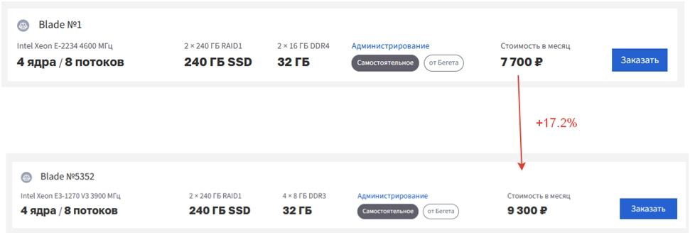 Популярный агрегатор Beget.com в 2022 году предлагал конфигурацию Blade1 за 7700, к текущему моменту цена на аналогичную конфигурацию выросла на 17.2%: