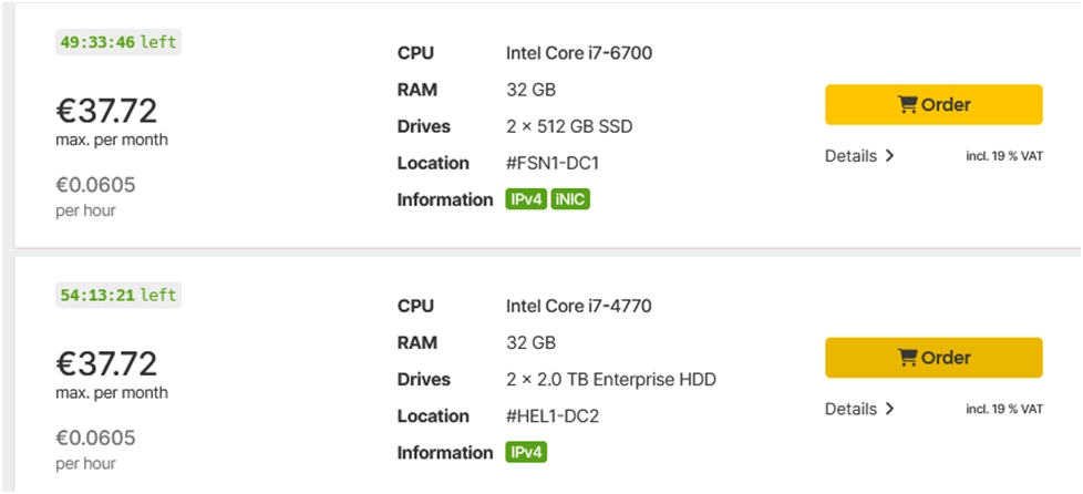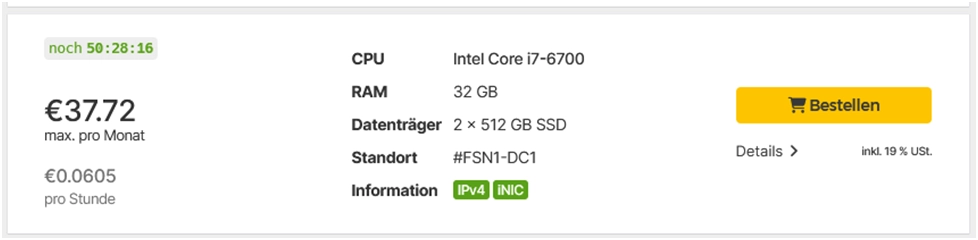 Давайте посмотрим за сколько можно сейчас взять сервер по минимальной стоимости у Hetzner: