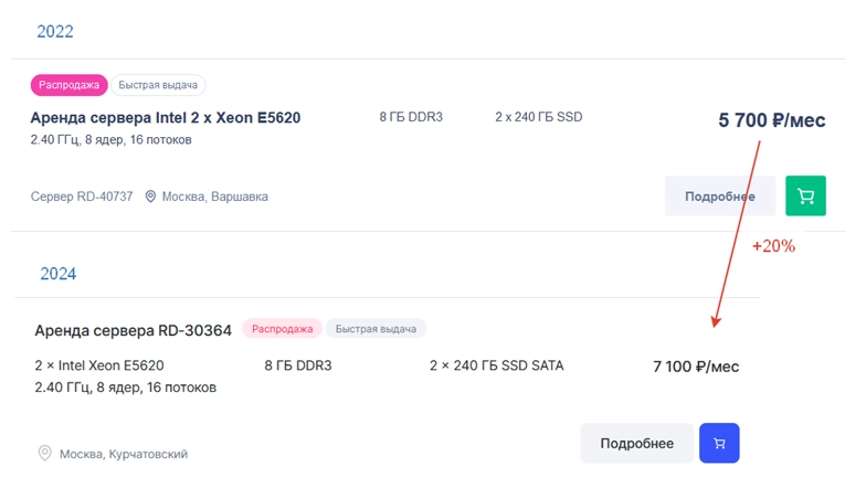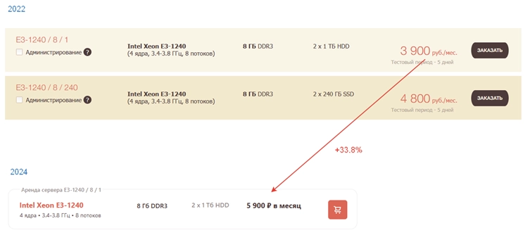Например, у одного из крупных игроков Timeweb можно увидеть, что в начале 2022 году самый дешевый сервер на Xeon – стоил 3900 руб/месяц (конфигурация E3-1240). По состоянию на 2024 тот же сервер стоит уже 5900 р, т.е на 33.8% выше.